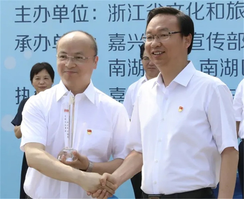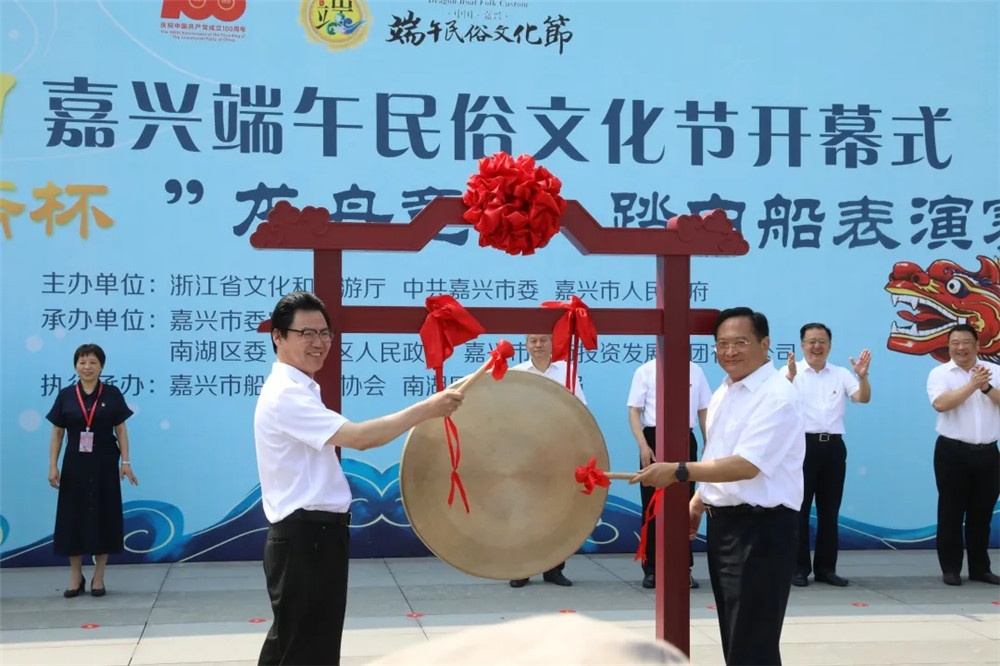 市委書記張兵(右)與省文化和旅游廳副廳長葉菁(左)為2021嘉興端午民俗文化節(jié)鳴鑼開幕