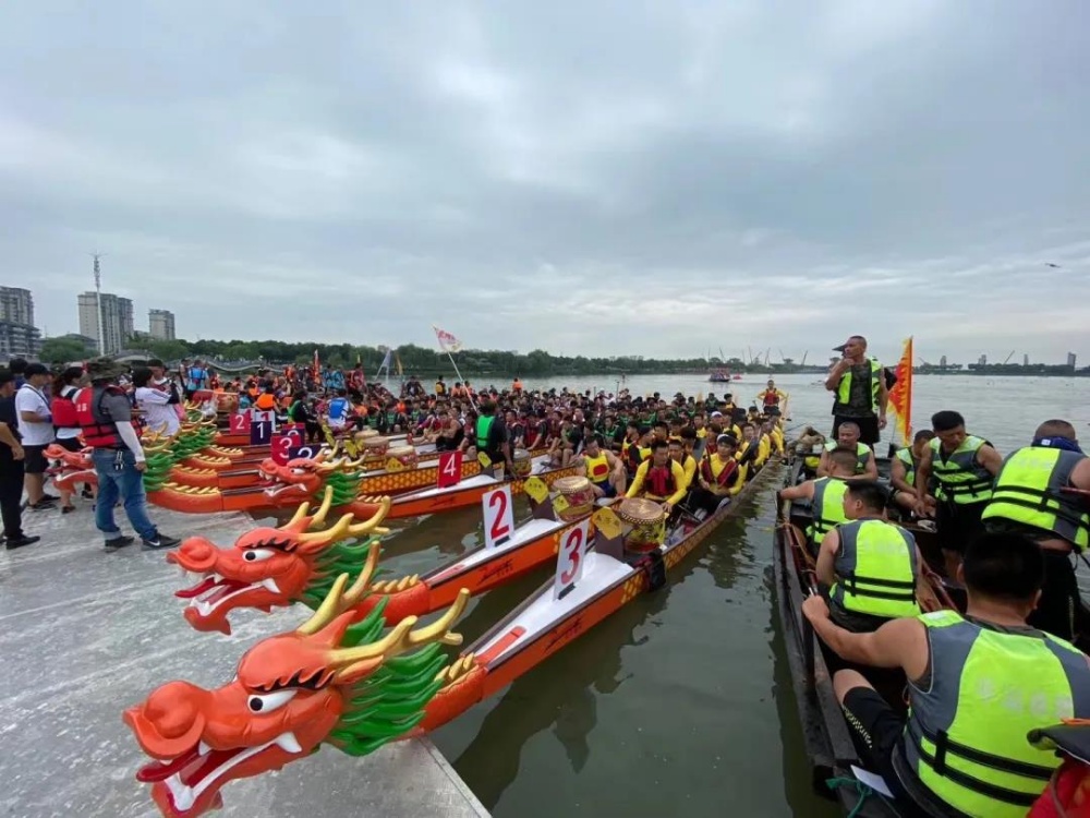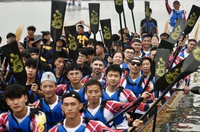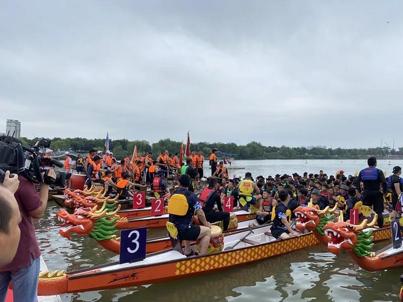 參賽選手們都信心滿滿,駕龍舟奮勇爭先,現(xiàn)場鼓聲陣陣、喊聲沖天。