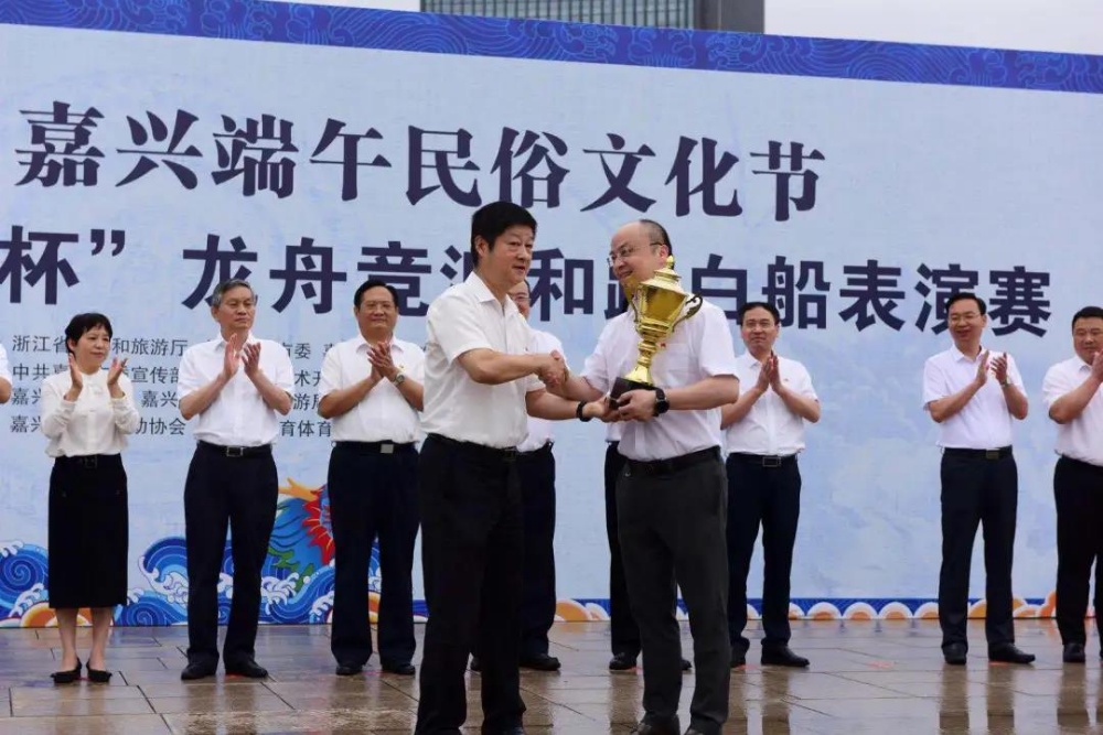 下午16時左右,我們迎來了“五芳齋杯”龍舟競渡賽的閉幕式。五芳齋實業(yè)副總經(jīng)理徐煒也在現(xiàn)場為本次參賽的健兒們頒發(fā)獎狀與獎金。