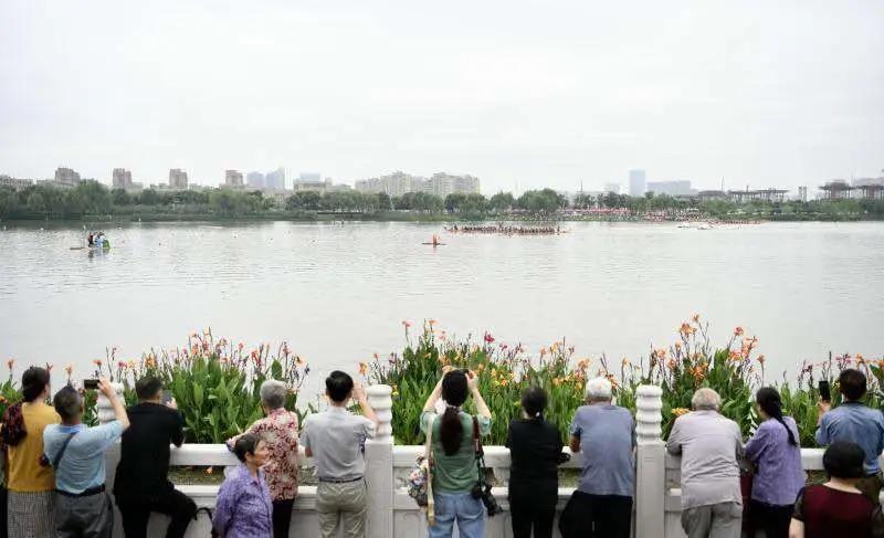 岸邊,來自世界各地歡度端午觀眾人頭攢動,吶喊加油聲持續(xù)不斷。龍舟競渡作為每年端午的極受歡迎的活動之一,吸引眾多市民、游客沿湖觀看,為湖中拼搏的運動員加油助威!