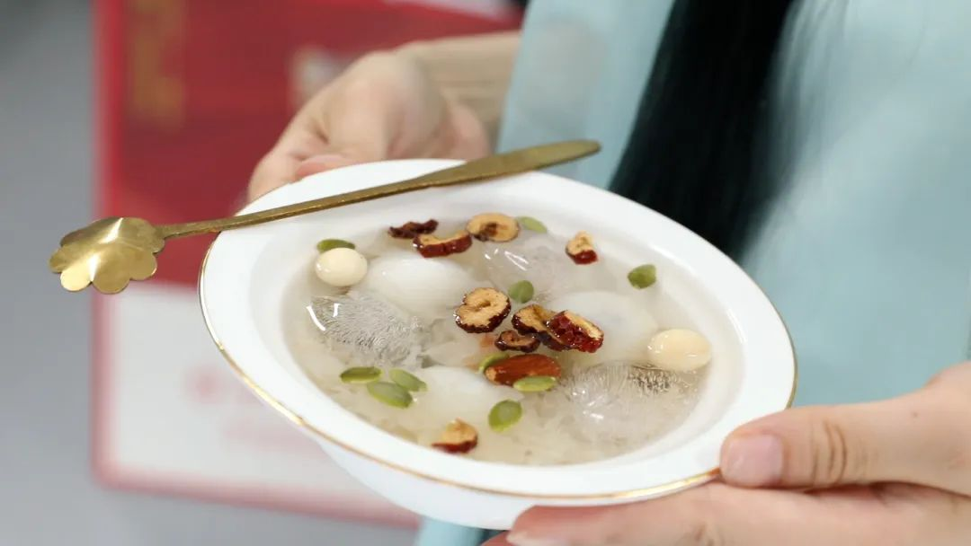 暑日心情容易煩躁,對(duì)此徐老師精心準(zhǔn)備古人同款的消暑秘方——五芳齋版 “冰雪冷元子”,煮熟的湯圓在冰水里浸泡過后,搭配冰鎮(zhèn)的五芳齋綠豆百合粥和燕窩銀耳羹,冰冰涼涼,甜甜糯糯,一秒解暑。