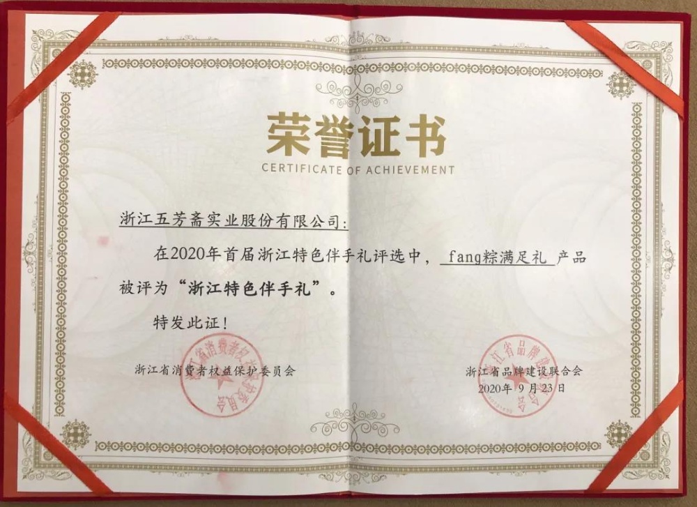本次發(fā)布會(huì),浙江省市場(chǎng)監(jiān)督管理局、浙江省消費(fèi)者權(quán)益保護(hù)委員、浙江省品牌建設(shè)聯(lián)合會(huì)等相關(guān)領(lǐng)導(dǎo)親臨現(xiàn)場(chǎng),為本次評(píng)選中獲得“首屆浙江特色伴手禮”稱號(hào)的產(chǎn)品隆重加冕。五芳齋選送的fang粽滿足禮也獲得了該項(xiàng)殊榮。